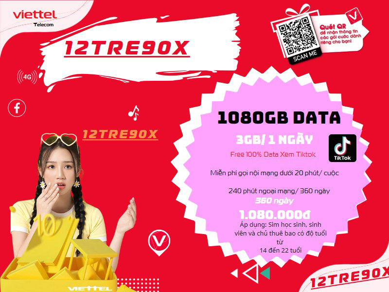Đăng ký gói 12TRE90X của Viettel, chỉ với giá là 1.080K cho 360 ngày sử dụng. Bạn nhận ngay 1080Gb data 4G tốc độ cao của Viettel để truy cập mạng internet trên điện thoại di động liên tục trong 12 tháng. Mỗi ngày sử dụng 3Gb data tốc độ cao, dùng hết 3Gb/ ngày dừng truy cập, ngày hôm sau dùng tiếp. Và bạn được miễn phí các cuộc gọi nội mạng Viettel dưới 20 phút + 240 phút gọi ngoại mạng trong nước của Viettel/ 12 tháng. Ngoài ra bạn sẽ được miễn phí 100% data xem ứng dụng Tiktok trên di động.
